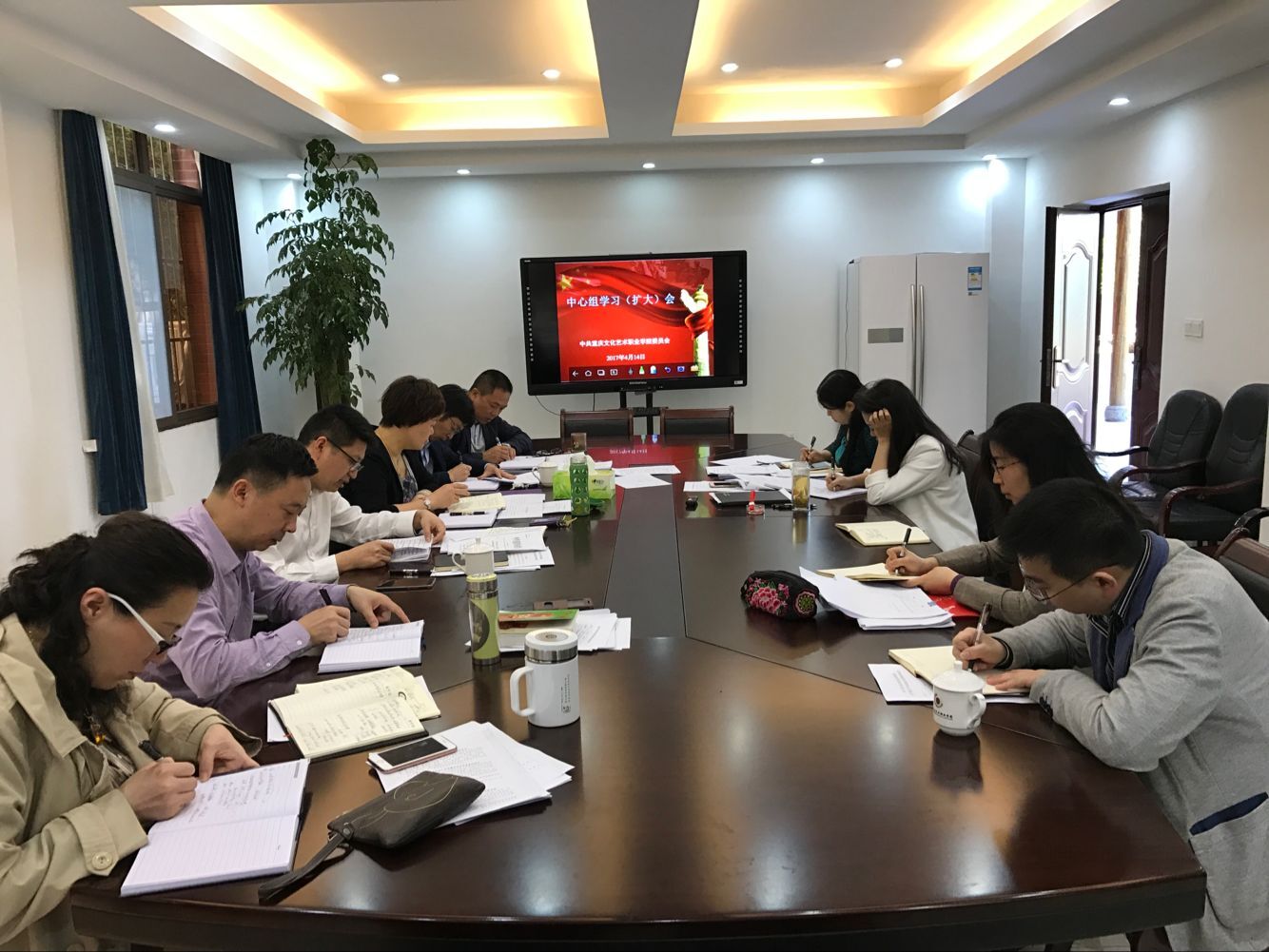 会上,院长吴小兰传达学习了市文化委党委中心组学习(扩大)会精神,包括习近平总书记在文艺工作座谈会上的讲话,习近平总书记在党的新闻舆论工作座谈会上的讲话精神,习近平总书记在中国文联十大及中国作协九大开幕式上的讲话,中共中央办公厅、国务院办公厅《关于实施中华优秀传统文华传承发展工程的意见》。副院长胡莉传达了教育部深化高校“放管服”改革电视电话会议精神。