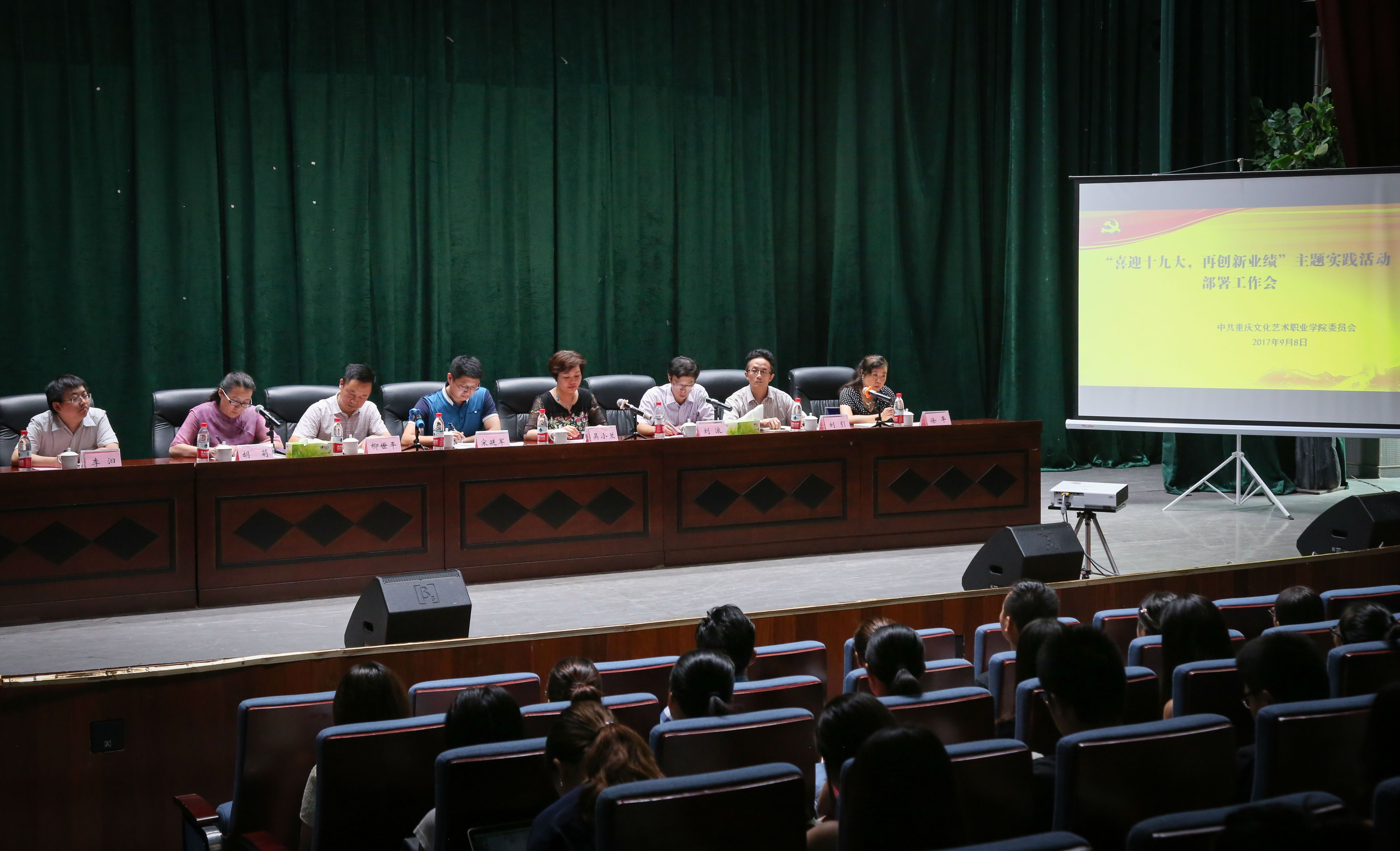 为深入推进“两学一做”学习教育常态化制度化,切实增强学院基层党组织的凝聚力和战斗力,进一步激发广大党员干事创业热情,以优异的成绩迎接党的十九大胜利召开,按照中央、市委和市文化委的部署要求,结合学院工作实际,学院党委决定深入开展以“喜迎十九大,再创新业绩”为主题的实践活动,9月8日,在巴南实训剧场召开了“喜迎十九大,再创新业绩”主题实践活动动员大会。