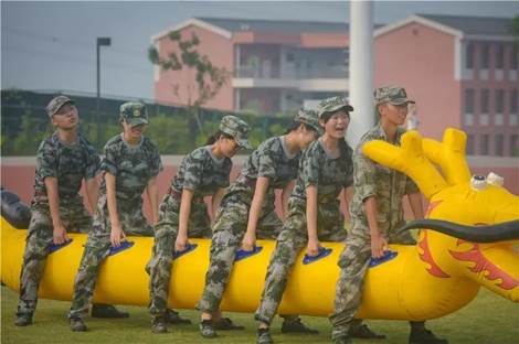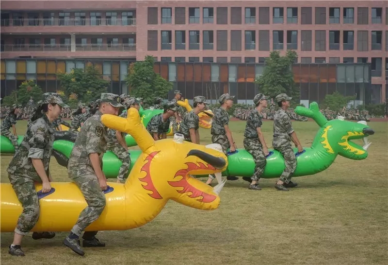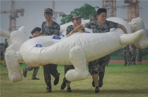 我们的趣味运动会分为“陆地龙舟”“龟兔赛跑”和“八人九足”三个环节。最先开始的游戏“陆地龙舟”由各连教官带领六位同学们进行,需要6个伙伴们步调一致、“驾龙西归”最先到终点为胜。腿太短协调性差都会成为失利的原因。
