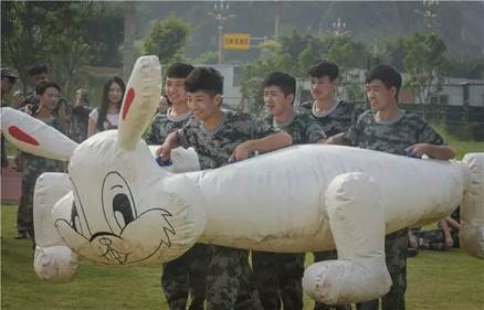 第二个游戏是“龟兔赛跑”。这个游戏需要5位同学钻进巨大的充气玩偶里抱住这个玩偶冲向终点。在这项游戏中出现了被队友踩掉鞋、被队友拖向或腾空架向终点等让人捧腹大笑的情况。