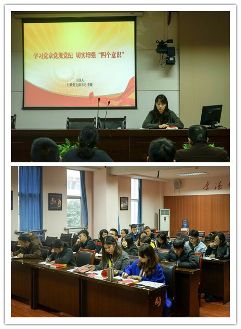 接着,支部书记开展了题为《学习党章党规党纪,届时增强“四个意识”》的党课,以提高党员“四个意识”和廉洁自律为主要内容,带领全体人员全面学习认真领会《中国共产党章程(修正案)》、中央纪委工作报告、《中国共产党廉洁自律准则》和《关于新形势下党内政治生活的若干准则》第十二章“保持清正廉洁的政治本色”。提高党员的党性修养,尤其是在日常管理工作中,坚持为教职工、为学生服务为根本,紧扣“立德树人”的教育理念,不忘初心,牢记使命,为学校发展贡献一己之力。